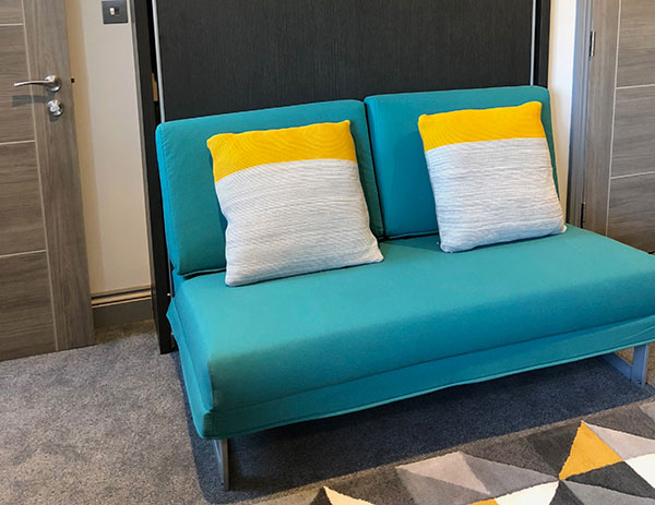 This studio apartment, located on the upper floor, benefits from being quieter and more secluded. The bathroom has an extra large shower cubicle and a skylight which can be opened too. This studio, though our smallest, features a clever hide-away kitchenette and smart-bed. It is quirky and ideally suited to those on a more restricted budget.